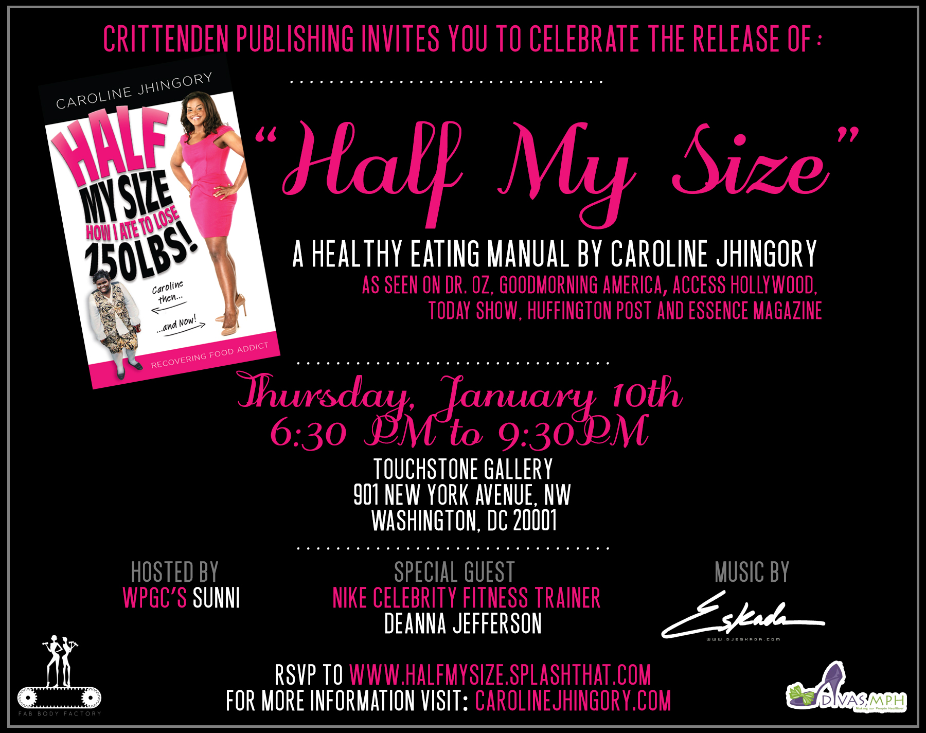 After the Macy’s event on Thursday I also went to a book launch for “Half My Size” by Caroline Jhingory.  About 10 years ago, Caroline lost 150 lbs and to this day she continues to maintain it.  She has a wonderful story and is inspiring people everywhere with her tale. She is also a DC native (and an Ellington grad I’ve learned through mutual friends).  One thing I really like about Caroline is that she does not pretend to be any more or less than she is.  She is not expert, just a recovering food addict who found a system that works and wants to share it.  There are some definite gems in her system like “exercise! the drug everyone can afford” and “never begin a diet that you can’t do for the rest of your life” (AMEN sister!!). Caroline and I It was a great gathering and Caroline was a delight, very genuine and down to earth.  It was great being able to support a fellow Washingtonian!! I am super excited to read the book and I hope you as well because one of you will get to as well!!!  More details to follow…   But first:Angelica, Corinne and myself I ran into some of my favorite fellow bloggers!! The lovely Angelica of Clarendon Moms | A Fashionable Playdate and Corinne of Carnelian Boutique. Sunni, Angelica and I Host for the night was the lovely Sunni of WPGC and she was jacket matching with Angelica!! #StylingInTheWinterWhite.   DSC02642   Tunes for the night were provided by DJ Eskada who was holding it down. For more event photos on the DCFunemployment page click here & For Caroline’s Event Photos Click Here. book launch   Now on to the exciting part!! Ways to Enter To Win the Book: