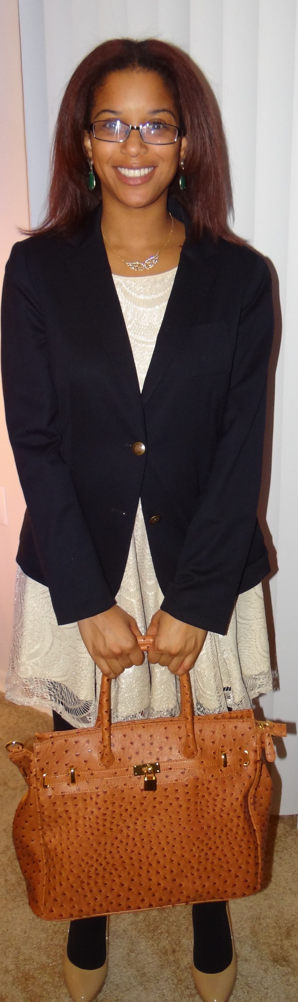What I WoreSo I started off with a great backless lace dress that I found from Current Boutique that I made appropriate with a double button blazer from the Gap.  My bag for the evening was a new favorite bag called Law from JustFab.com that comes in a range of fabulous colors