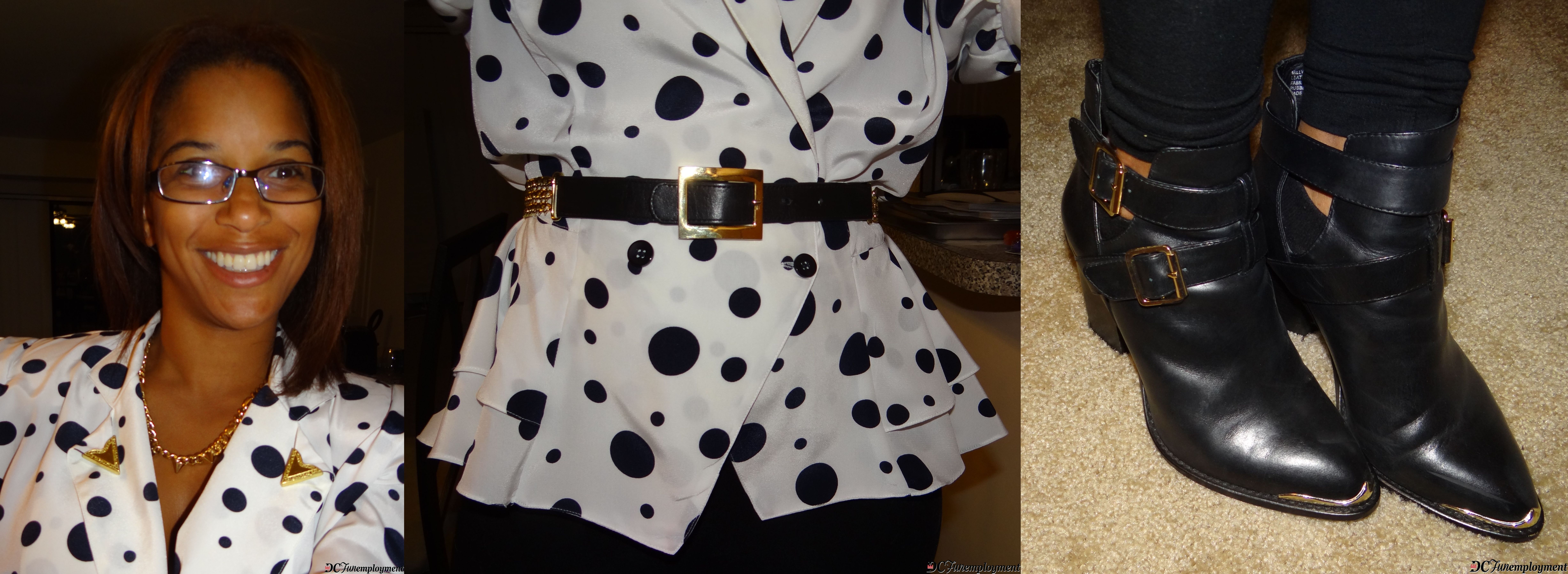 I rocked a vintage peplum polka dot top that I picked up at an estate sale with an adorable leather and chain belt that I picked up at the Goodwill Gala combined with some Gap leggings and these adorable Shoemint booties that I am loving for fall!!
